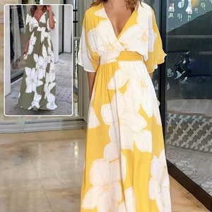 Flower Printed V-neck Batwing-sleeved Dress Fashion Elegant Backless Long Dresses Women's Clothing